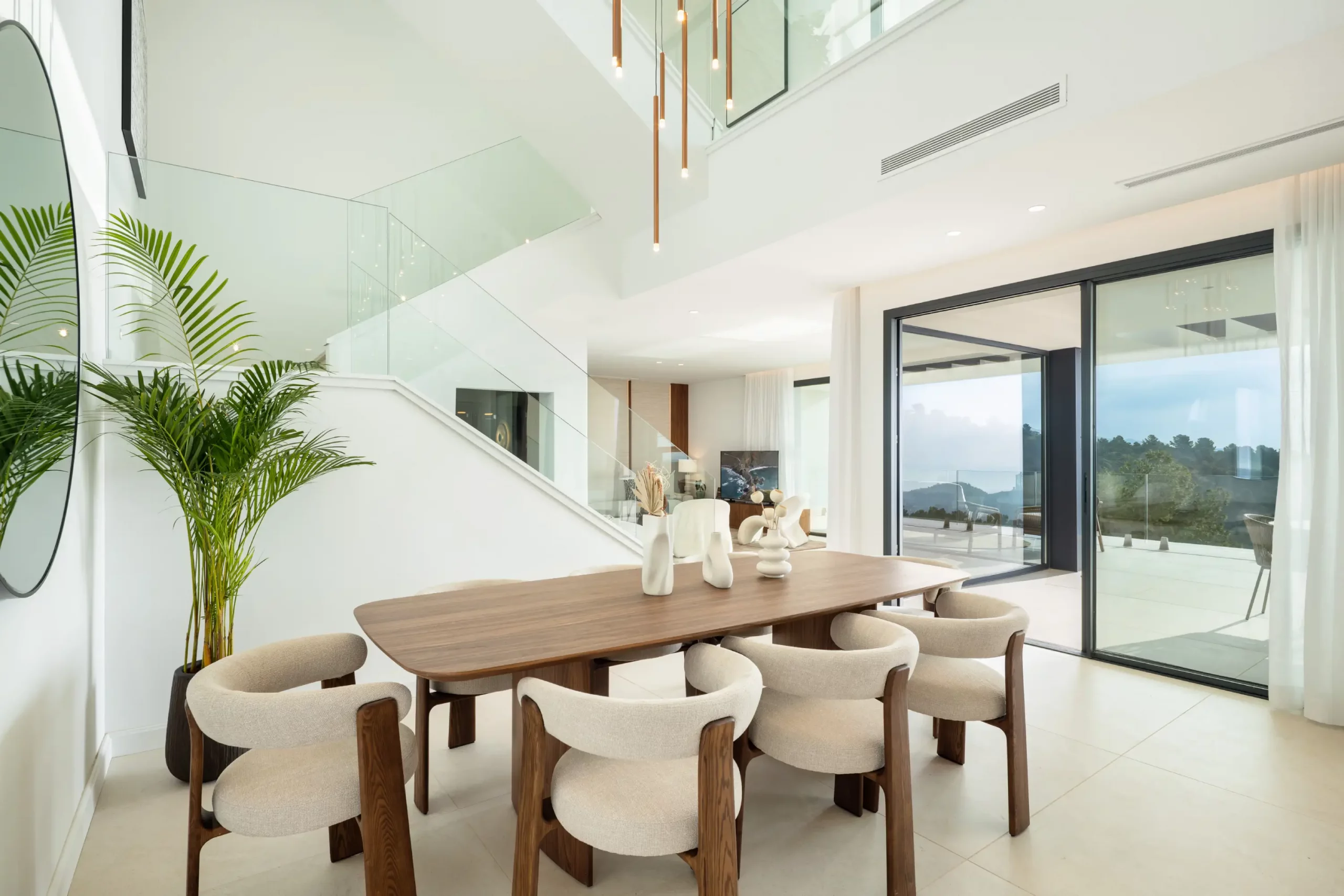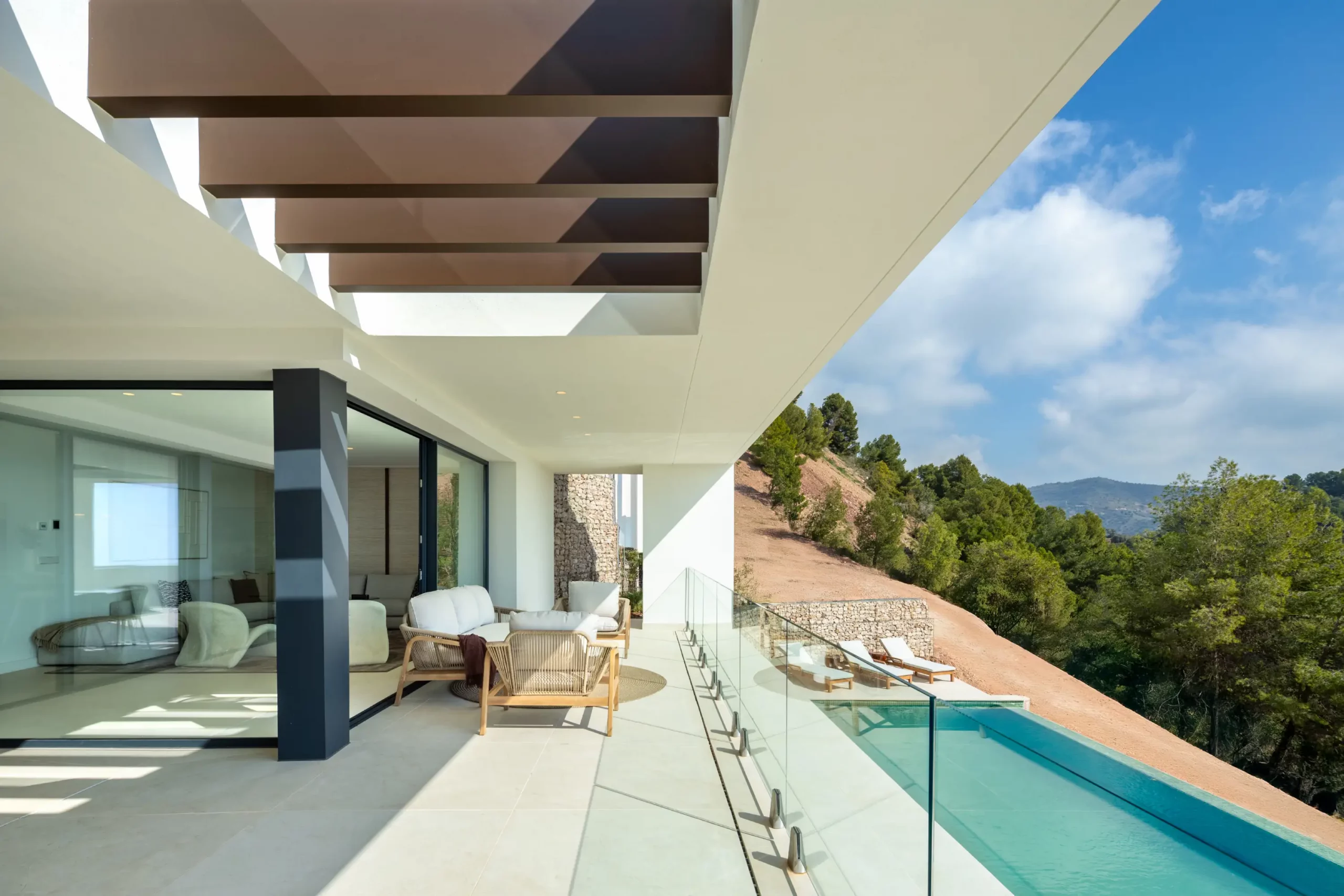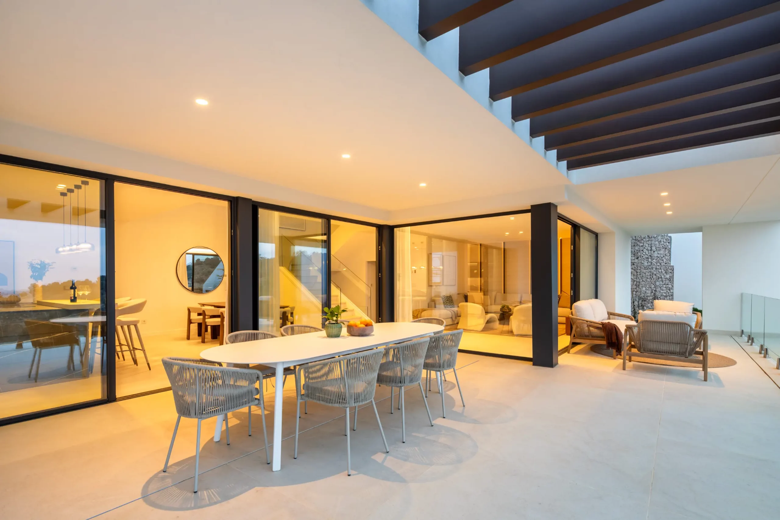 The villa has elegant simple façades and extensive use of glass, ensuring maximum natural light and space throughout. The terrace doors provide direct access to stunning covered and open terraces, with an exterior dining & BBQ areas, and of course a large private pool
